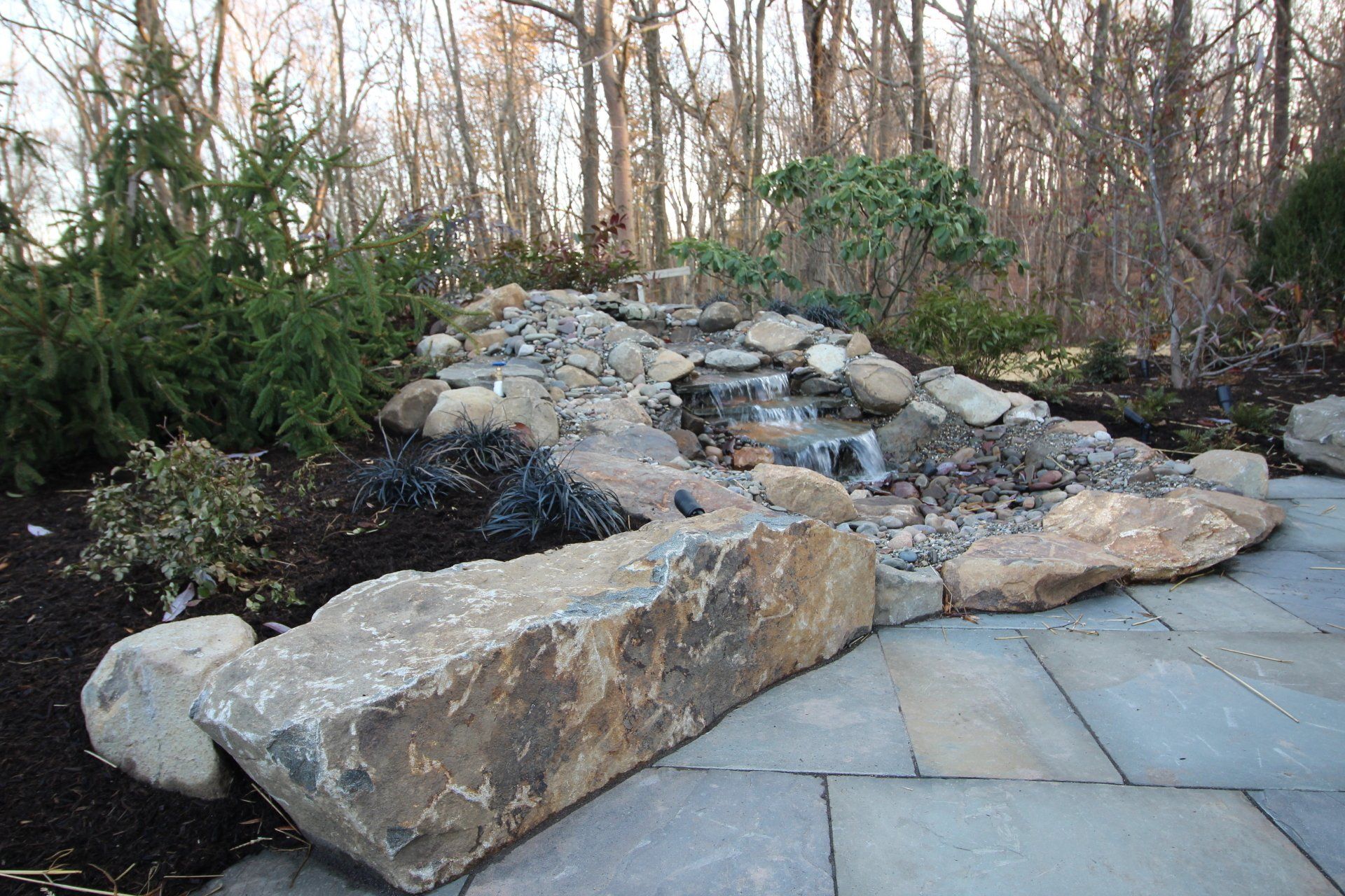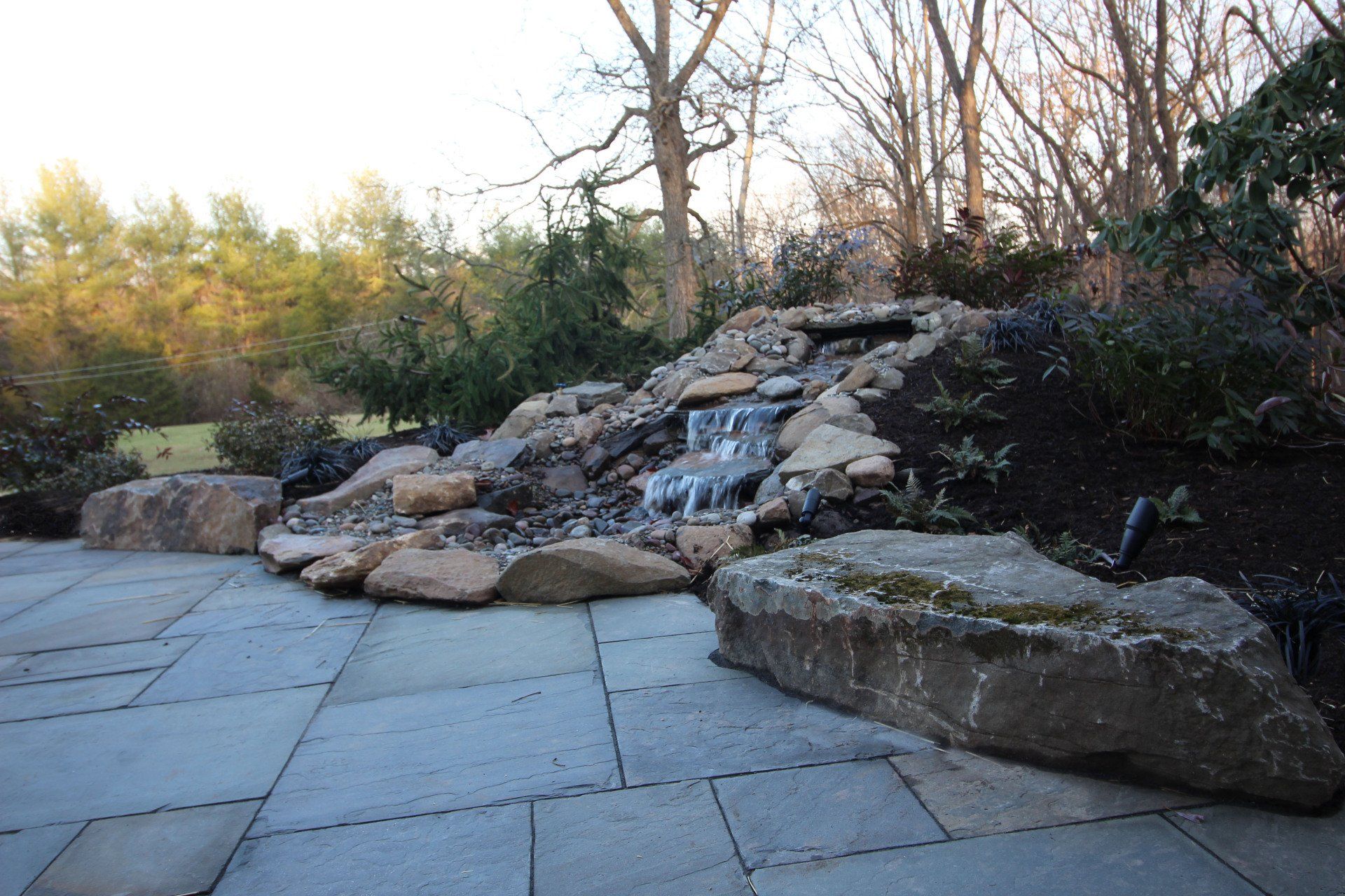 Pictured is this pondless water feature that works perfectly on this property near Plymouth Meeting, PA. These beautiful water accents can also be installed indoors as was done in this atrium in Bryn Mawr, PA.